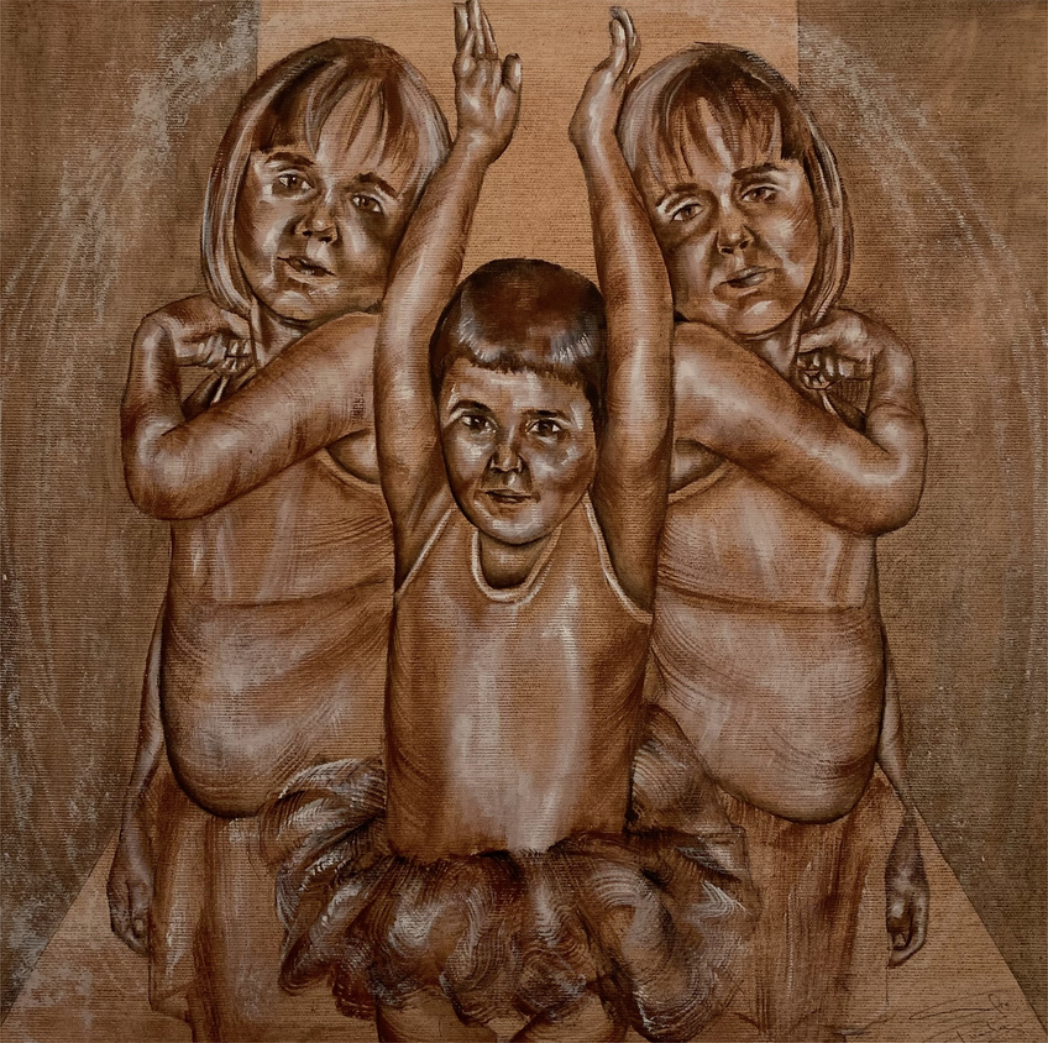 This The painting shows two dancing siblings who are represented by an imaginary reflection in the centre of the picture. My aim was to create a symmetrical composition with figurative figures.